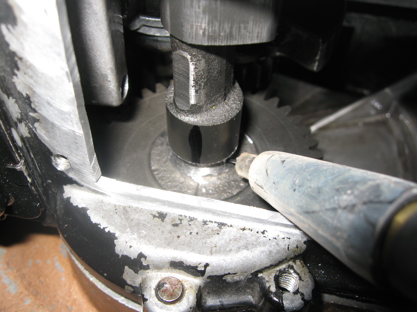 Here's where you can see how a windowed block is necessary to perform this kind of hack job. The cam must remain perfectly aligned in the block. Here you see I'm welding the 5hp shaft onto the 3.5hp gear and keeping it in perfect alignment. The lobe centerline in relation to the gear must be kept for proper valve timing. The Briggs cam gives off easy to read visible cues. I use a stock cam to compare the lobe lift centerline with the casting seam on the gear.