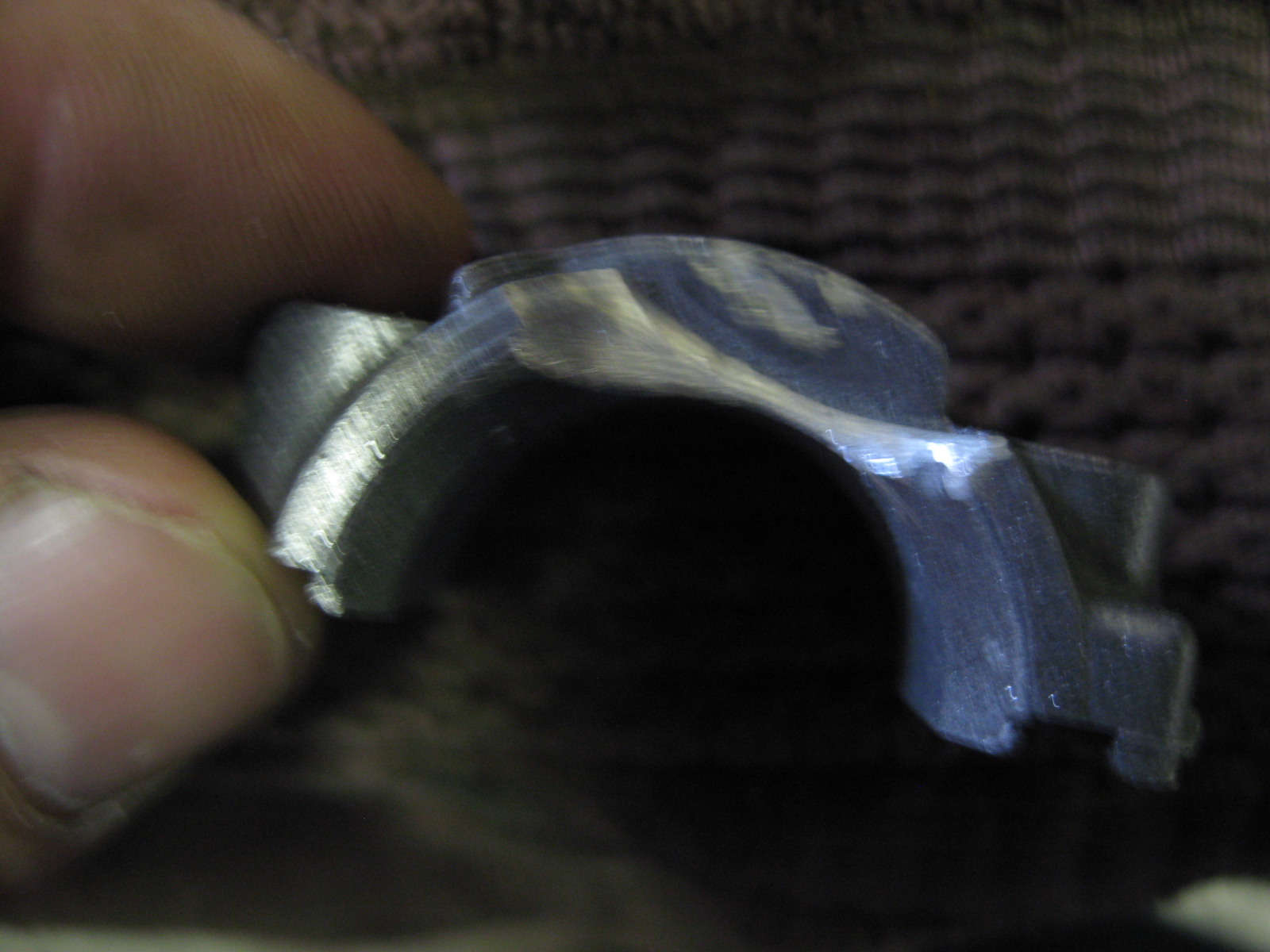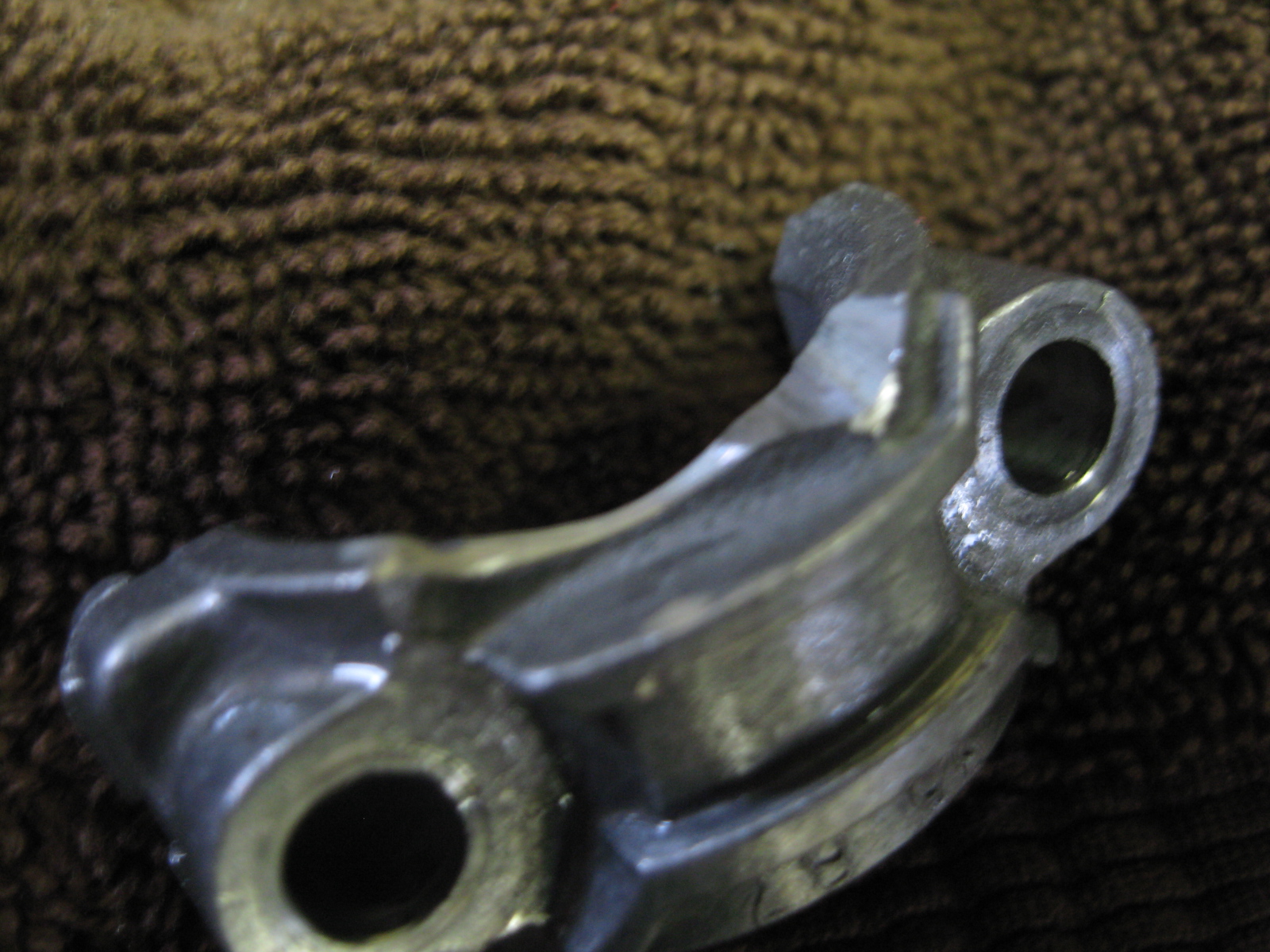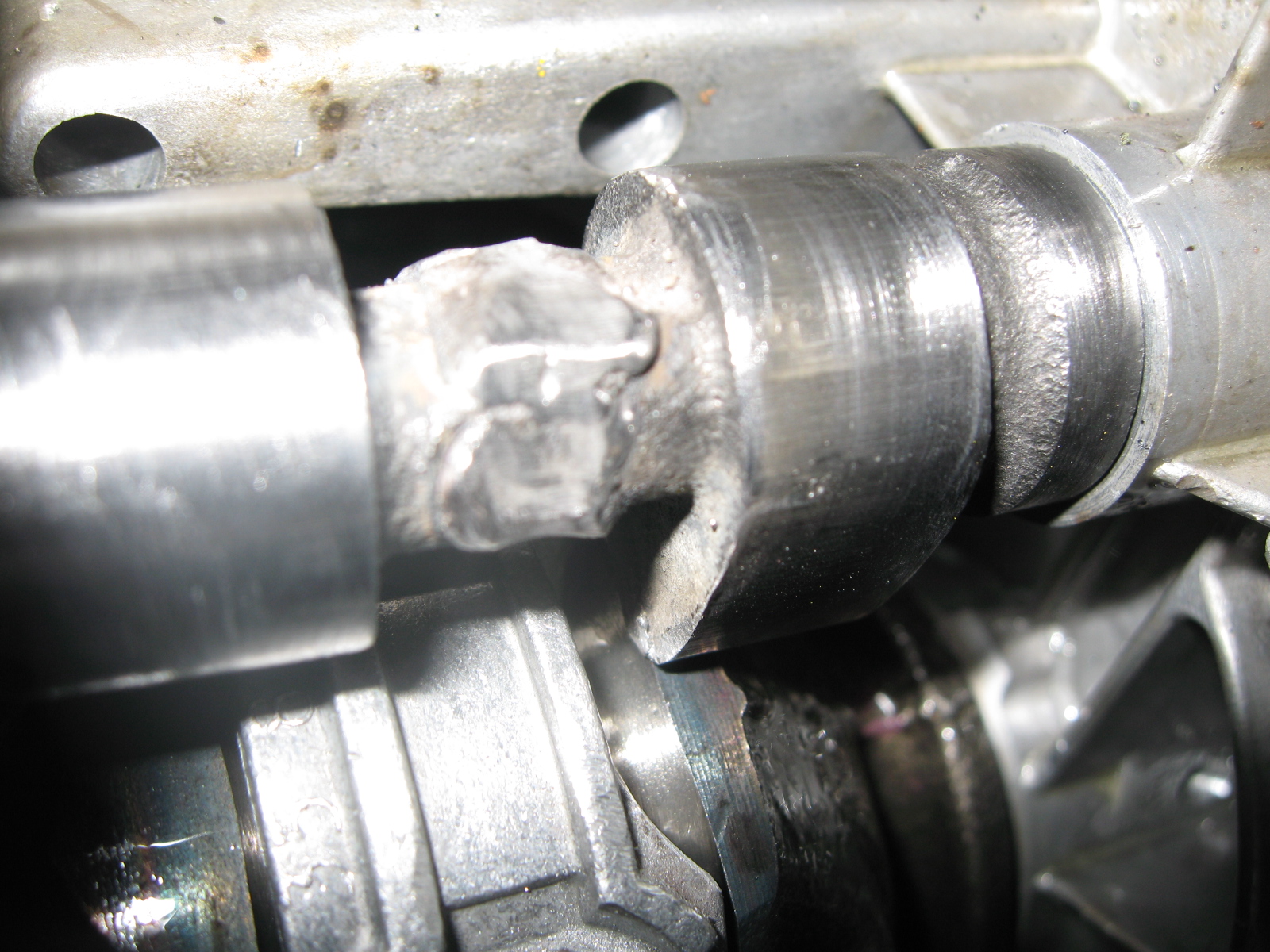 Now I have a 5hp camshaft welded to the 3.5hp gear and able to physically fit in the block. Excellent!! 1/10 of an inch increased lift and a much more powerful engine right? Not so fast. Internally there are many clearance issues. Due to the extra 0.10" of lobe lift on the cam noses, there is now interference on several parts on the other internal rotating parts of the engine, the intake cam lobe nose now will hit the leading edge of the connecting rod cap during a rotation, and the exhaust lobe nose will now contact the crank counterweight during its rotation. Also the oblong shape of the middle of the new shaft between the lobes (along with the weld) will now contact the trailing end of the connecting rod bolt. See pics...
